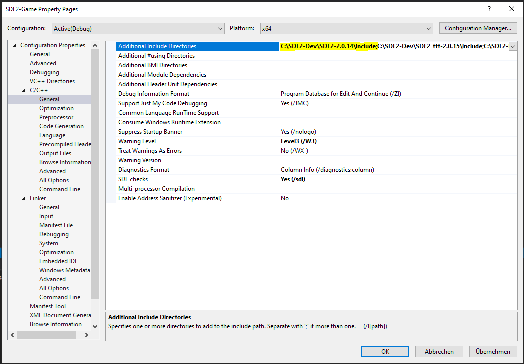 Include-Pfad von SDL2 hinzufügen. Properties -> C/C++ -> General -> Additional Include Directories