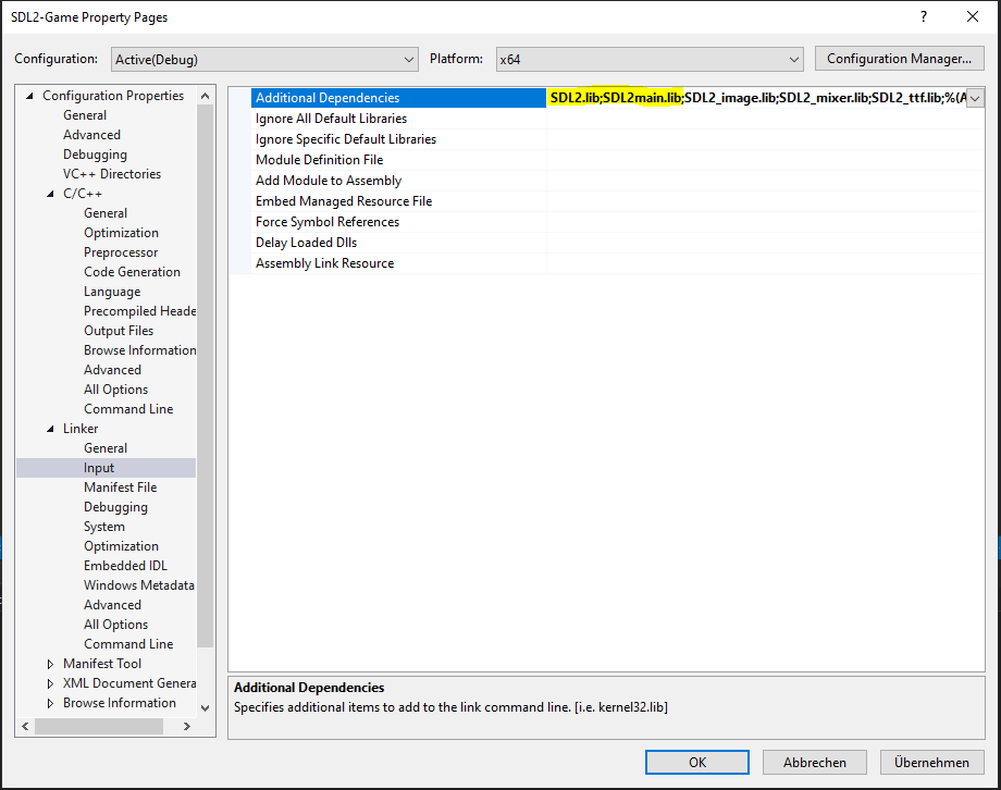 Bibliothek-Dateien von SDL2 angeben. Properties -> Linker -> Input -> Additional Dependencies